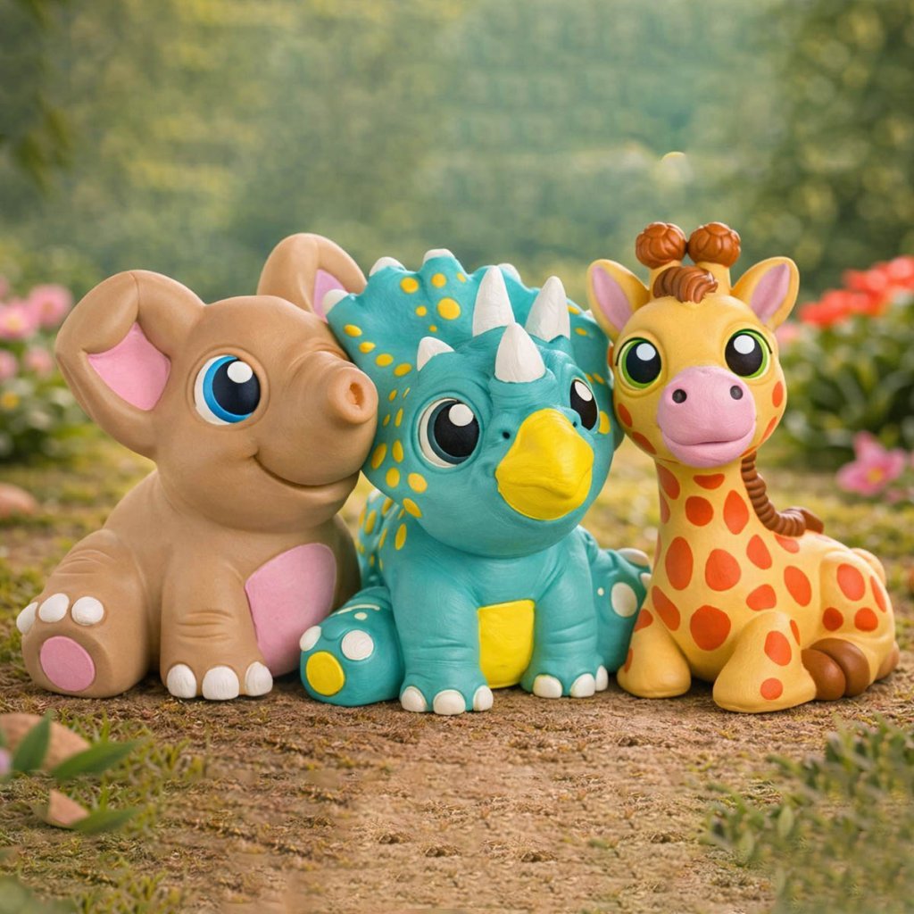 Zvýhodněný set tří roztomilých kamarádů – sloníka, triceratopse a žirafy – který vznikne v rukou vašeho dítěte. Díky velkým plochám a pevnému tvaru je ideální pro první malování dětí od 3 let.